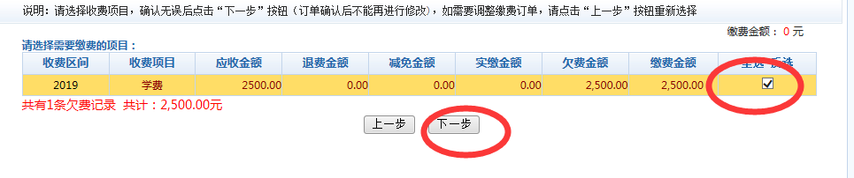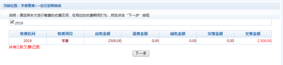 2、本次輔修學(xué)費(fèi)收費(fèi)區(qū)間為“2019”收費(fèi)項(xiàng)目為“學(xué)費(fèi)”,應(yīng)收金額為2500元。