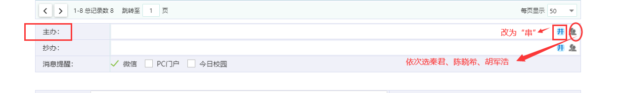 3.學(xué)院教學(xué)院長(zhǎng)審批完成后,教學(xué)秘書(shū)可看到審批結(jié)果,再由教學(xué)秘書(shū)將學(xué)院審批后的調(diào)整申請(qǐng)?zhí)峤唤虅?wù)處審批,主辦選擇“串”的方式,交辦人員依次選擇教務(wù)處專(zhuān)業(yè)建設(shè)科秦君、教務(wù)處副處長(zhǎng)陳曉希、教務(wù)處處長(zhǎng)胡軍浩。