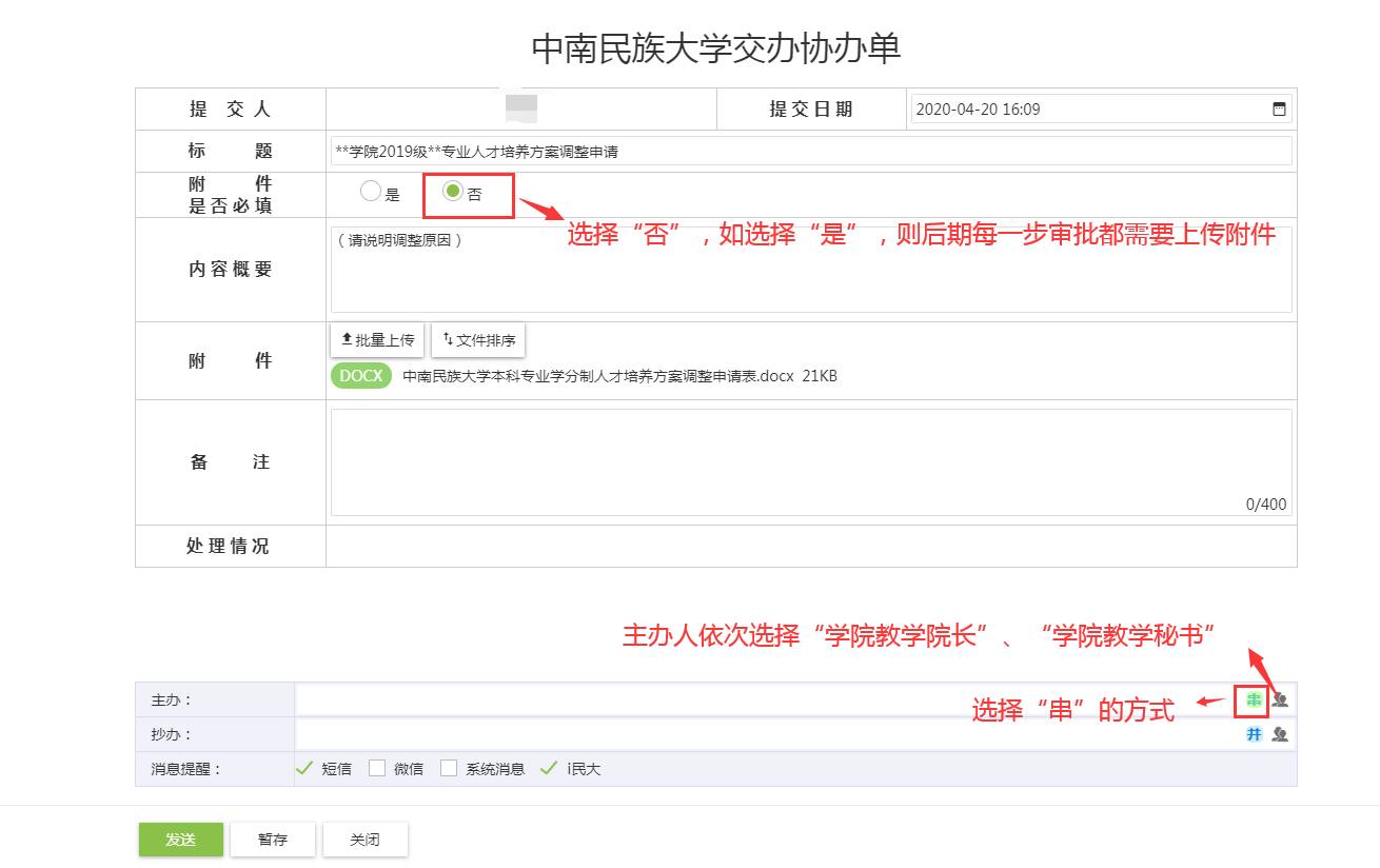 各教學(xué)單位: 為保證我校本科專(zhuān)業(yè)學(xué)分制人才培養(yǎng)方案的順利實(shí)施,學(xué)校決定啟動(dòng)線上審批的方式完成各專(zhuān)業(yè)人才培養(yǎng)方案異動(dòng)。具體操作流程如下: 一、填寫(xiě)“中南民族大學(xué)本科專(zhuān)業(yè)學(xué)分制人才培養(yǎng)方案調(diào)整申請(qǐng)表” 下載地址:教務(wù)處主頁(yè)-相關(guān)下載 http://www.g1tmj6w.xyz/jwc/info/1007/1189.htm 二、線上申請(qǐng)及審批 1.申請(qǐng)人登錄信息門(mén)戶-OA辦公-交辦協(xié)辦-發(fā)送列表-新建,主辦選擇“串”的方式,交辦人員依次選擇“學(xué)院教學(xué)院長(zhǎng)”、“學(xué)院教學(xué)秘書(shū)”,提交學(xué)院審批。