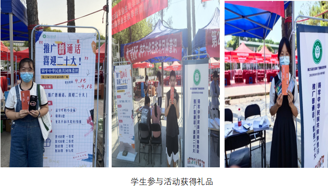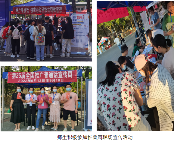 本次推普周緊緊圍繞主題,以線上線下結(jié)合的方式開展了一系列富有成效的推廣活動(dòng)。活動(dòng)前夕,通過(guò)在公共場(chǎng)所懸掛橫幅、張貼海報(bào),在官方QQ發(fā)布推普活動(dòng)宣傳“說(shuō)說(shuō)”,轉(zhuǎn)發(fā)“說(shuō)說(shuō)”集贊領(lǐng)獎(jiǎng)品等形式,營(yíng)造了濃厚的推普氛圍。推普周期間通過(guò)校園廣播臺(tái)、教務(wù)處微信公眾號(hào)等平臺(tái)開展推普小知識(shí)、公益廣告視頻等推普宣傳。9月15日至18日在第一與第二食堂間開展線下展臺(tái)宣傳活動(dòng),共發(fā)放推普宣傳冊(cè)1000份、書簽500套、宣傳手提袋150個(gè)。另外設(shè)置辨析易錯(cuò)字詞、讀音辨析、成語(yǔ)辨析、接詩(shī)句、歇后語(yǔ)、猜字謎、對(duì)對(duì)子、繞口令等趣味活動(dòng),吸引了數(shù)千名師生的熱情參與。