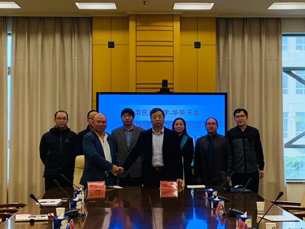 2022年11月25日上午,中南民族大學—武漢華榮天香生態(tài)農業(yè)科技發(fā)展有限公司共建藥用植物園續(xù)簽戰(zhàn)略合作協(xié)議暨實習基地建設研討會在我校學術交流中心舉行。校黨委常委、副校長杜冬云,華榮天香有限公司董事長盧祖林,教務處、黨委學生學工部、科學研究發(fā)展院、藥學院、生命科學學院、生物醫(yī)學工程學院、資源與環(huán)境學院、公共管理學院負責人參加會議。會議由教務處處長黃迎新主持。