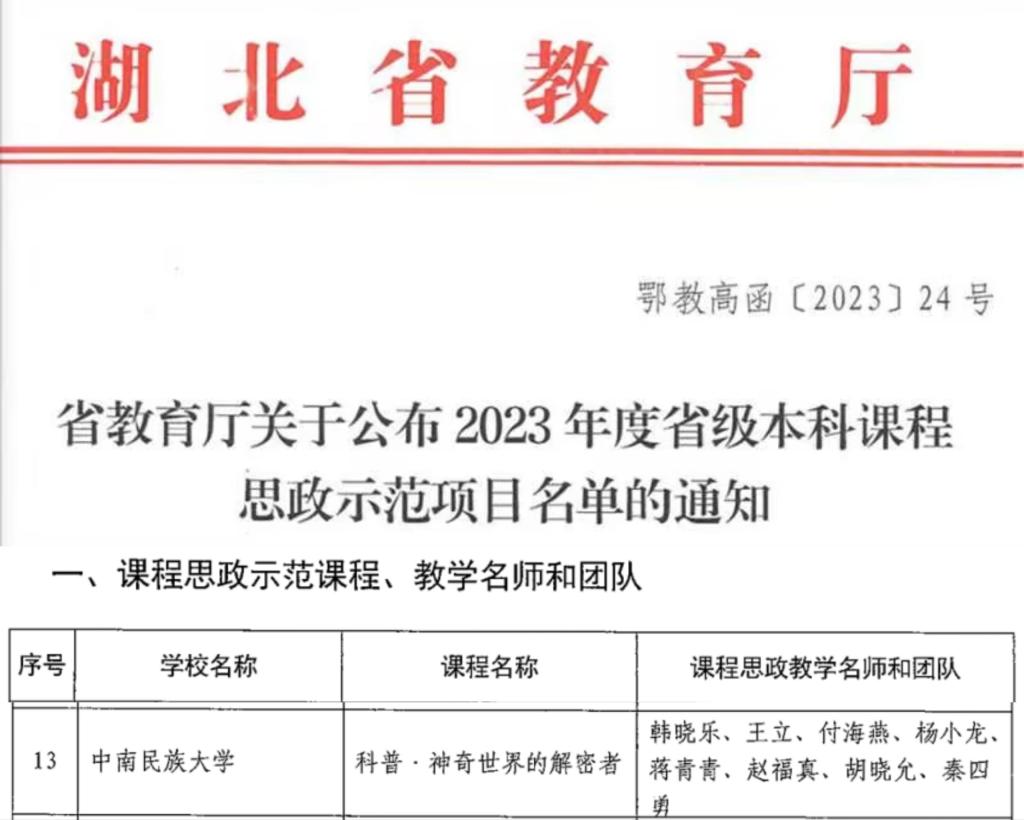 近日,湖北省教育廳公布了2023年度省級本科課程思政示范項目名單,我校課程《科普·神奇世界的解密者》獲課程思政示范課程項目,該課程負責人和團隊被認定為省級課程思政教學名師和教學團隊。據悉,本次全省共立項39項課程思政示范課程、課程思政教學名師和團隊。