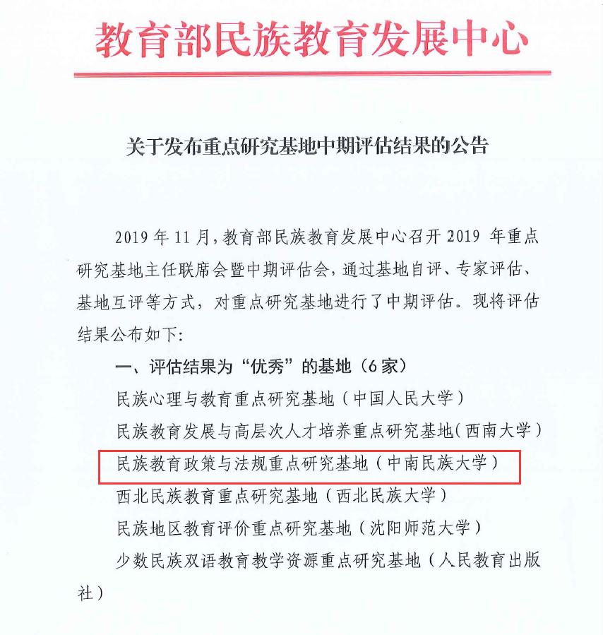 近日獲悉,教育部民族教育發展中心召開2019年重點研究基地主任聯席會議暨中期評估會,通過基地自評、基地互評、專家評估等方式,對重點研究基地進行了中期評估。我校民族教育政策與法規重點研究基地順利通過中期評估,評估結果為優秀。