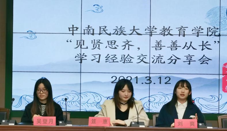 為幫助同學們正確認識自我,掌握高效學習方法,明確未來發展方向。3月12日晚,我院于15棟教學樓特別舉辦“見賢思齊,善善從長”學習經驗分享會。本次活動特別邀請到教育學17級學生吳登月、教育技術學17級學生劉爽和應用心理學17級學生笪惠為大家答疑解惑,輔導員譚閨臣老師進行總結點評。