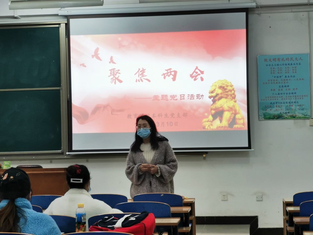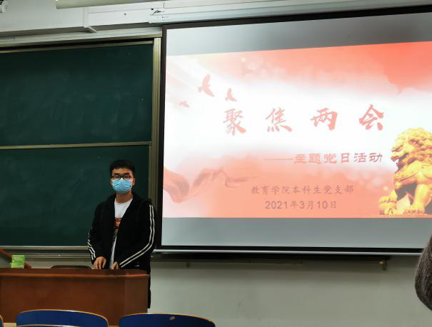 一年一度的全國兩會再次到來,為了認真貫徹“兩會”精神,提高全體黨員的政治素養,從而更好地發揮黨員的模范帶頭作用,3月10日晚,教育學院本科生黨支部在15棟410教室開展了聚焦“兩會”主題黨日活動,宣傳本次“兩會”的重要精神。輔導員譚閨臣老師、教育學院本科黨支部全體成員參加了本次活動。