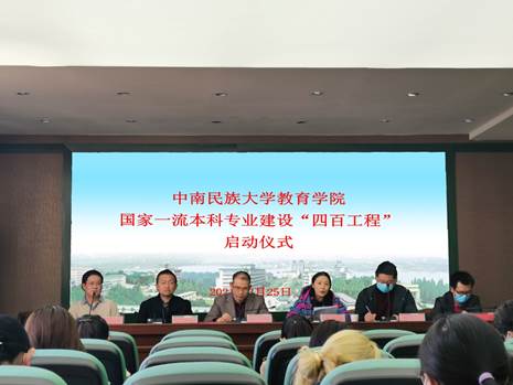 2021年3月25日,中南民族大學教育學院國家級一流本科專業建設的“四個一百工程”啟動儀式在15棟7樓多功能廳順利舉行。學工處處長李川國、教務處副處長胡鵬、光谷實驗小學校長孔德勇、教育學院院長康翠萍、黨委書記田恩舜、黨委副書記孫冰、副院長羅建河等領導和專家出席了此次啟動儀式。