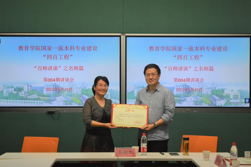 5月13日,中南民族大學(xué)教育學(xué)院“四百工程”——“百師講談”之名師篇第004期講談會(huì)在15棟733教室順利舉行。本次講談會(huì)的主講人為武漢第三寄宿中學(xué)、武漢第三初級(jí)中學(xué)吳曉紅校長(zhǎng)。教育學(xué)院羅建河副院長(zhǎng)與汪丞教授、本科學(xué)生參加了本次講談會(huì),羅建河副院長(zhǎng)代表學(xué)院向吳校長(zhǎng)頒發(fā)了“國(guó)家級(jí)一流本科‘教育學(xué)’專業(yè)實(shí)踐導(dǎo)師”與“教育碩士專業(yè)實(shí)踐導(dǎo)師”聘書。