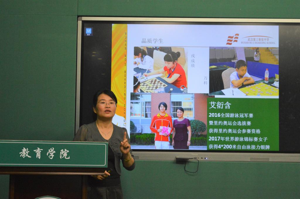 吳曉紅校長(zhǎng)本次演講的主題是“新時(shí)代呼喚‘四有教師’”。吳校長(zhǎng)首先闡述了“四有教師”的內(nèi)涵,“四有”好教師須有理想信念,有道德情操,有扎實(shí)知識(shí),有仁愛之心。吳校長(zhǎng)列舉了武漢第三寄宿中學(xué)具體的教學(xué)實(shí)踐活動(dòng)與生動(dòng)的學(xué)生培養(yǎng)實(shí)例,向同學(xué)們介紹了真實(shí)的學(xué)校教育,教師所面對(duì)的是學(xué)生的特殊性和多變性,在復(fù)雜多變的教育教學(xué)實(shí)踐中,教師需具備超前的意識(shí)與創(chuàng)造性,引導(dǎo)學(xué)生成長(zhǎng)。隨后,吳校長(zhǎng)闡述了新時(shí)代教育發(fā)展背景下,教師需具備“以天下為己任”的崇高職業(yè)意識(shí)與時(shí)代擔(dān)當(dāng),成為新時(shí)代的“四有教師”,這在學(xué)生成長(zhǎng)中起到不可替代的作用。