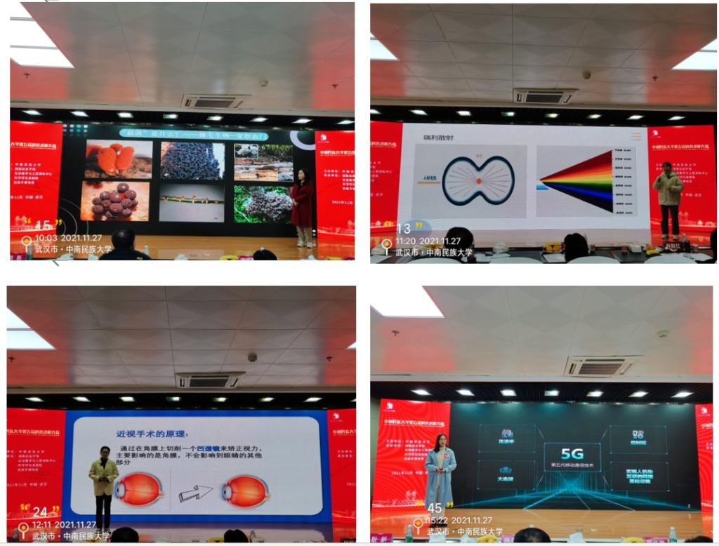 11月27日,為深入實施創新驅動發展戰略,普及科學知識,弘揚科學精神,提升全校各族師生的科學素養,并選拔2022年度國家民委、湖北省和武漢市科普講解大賽的參賽選手,學校舉辦第五屆中南民族大學科普講解大賽。比賽分為教師組與學生組,我院周菁菁老師作為教師代表,小學教育專業熊倩、教育技術學專業劉思怡與李舒軒作為學生代表參賽。