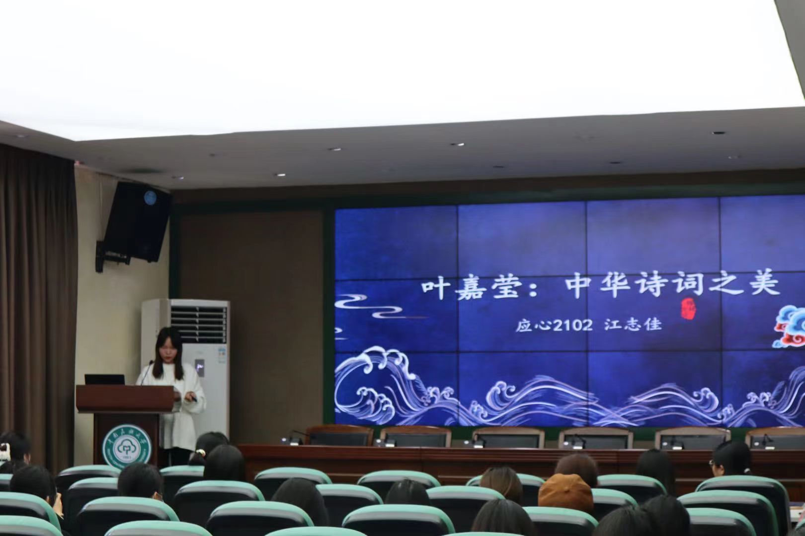 “道中華之美,美中華之道”,為響應(yīng)民委號(hào)召,百篇研讀活動(dòng)增設(shè)“道中華公眾號(hào)推文分享”環(huán)節(jié)。來自應(yīng)用心理學(xué)的江志佳同學(xué)與我們分享了閱讀道中華公眾號(hào)推文《葉嘉瑩:什么是中華詩詞之美》的感悟,中華詩詞是中華民族五千年的思想結(jié)晶,為我們的民族文化添上了濃墨重彩的一筆。江志佳同學(xué)從蘇軾的《定風(fēng)波》講起,帶領(lǐng)大家領(lǐng)略了中華古典詩詞之美,并結(jié)合推文內(nèi)容向大家介紹了葉嘉瑩先生關(guān)于中華詩詞傳播和文明互鑒的觀點(diǎn)。