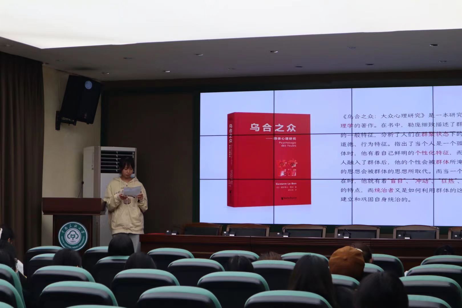 為什么個(gè)人處于群體中時(shí)更容易沖動(dòng)?來自教育學(xué)的王一帆同學(xué)向大家介紹勒龐的《烏合之眾》時(shí)給了我們答案,當(dāng)群體面臨問題時(shí),盲目沖動(dòng)往往代替思考。王一帆同學(xué)在分享自己的閱讀體驗(yàn)提到要批判性地看這本書,不要當(dāng)《烏合之眾》這本書的烏合之眾,在群體中要保持自我思考的能力并理性地分析問題。