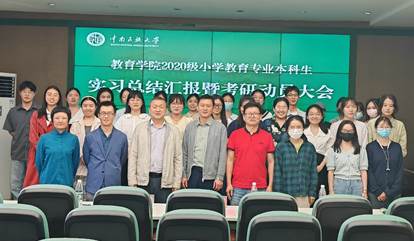 為總結本學期小學教育2020級本科生的教育實習工作,并做好考研動員工作,5月25日下午,學院在15-741教室舉辦了2020級小學教育專業本科生實習總結暨考研動員大會。學院黨委書記周剛、院長田恩舜、黨委副書記孫冰、小學教育系主任宋潔絢、學工辦主任艾力亞爾·克里木、20級班導師胡炳仙、余瑤及20級、21級小學教育專業全體同學參加會議。會議由小學教育2001班陳旭陽主持。