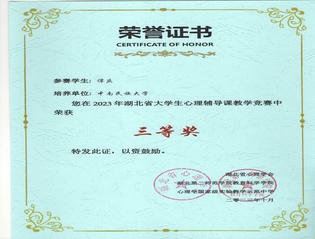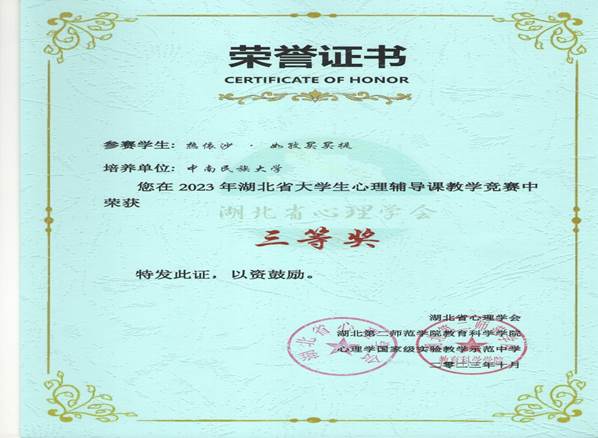 2023年10月22日,2023年湖北省大學生心理輔導課教學競賽落幕,我院應用心理學專業本科生羅粵尹、譚慶、熱依沙·如孜買買提都獲得三等獎。