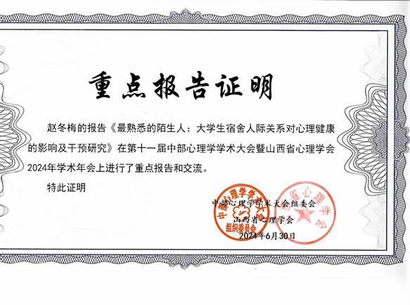 教育學(xué)院應(yīng)用心理學(xué)專業(yè)的教師趙冬梅、楊文嬌和陳勇杰向大會提交了學(xué)術(shù)報告,其中趙老師在大會上做了重點報告。趙老師以“最熟悉的陌生人:大學(xué)生宿舍人際關(guān)系對心理健康的影響及干預(yù)研究”為題,報告了系列研究成果,這也是趙老師主持的教育部人文社會科學(xué)研究一般項目的階段性成果。會議期間,我校教師與來自中部六省的參會學(xué)者進行了深入廣泛的學(xué)術(shù)交流。此次參會提升了我校應(yīng)用心理學(xué)專業(yè)在學(xué)界的知名度,增強了本專業(yè)教師與國內(nèi)其他學(xué)者的學(xué)術(shù)交流與合作。