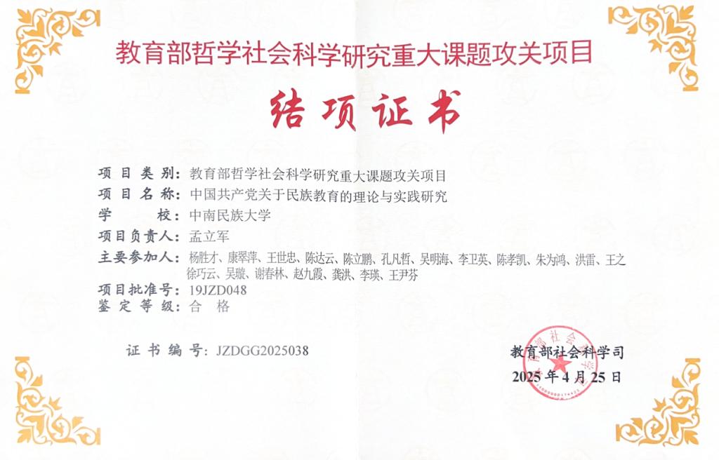 經教育部社會科學司審核,該項目符合《教育部人文社會科學研究項目成果鑒定和結項辦法》規定,鑒定等級為“合格”(項目批準號:19JZD048,證書編號:JZDGG2025038)。《中國共產黨關于民族教育的理論與實踐研究》項目聚焦中國共產黨領導下民族教育的發展脈絡,系統梳理理論成果與實踐經驗,對于鑄牢中華民族共同體意識、推動民族地區教育現代化具有重要理論和現實意義。