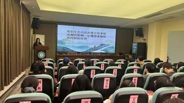 會議開始,25級心理健康專業干瀟涵同學分享了《累積生態風險對青少年手機成癮的影響:心理資本和自我控制的作用》一文。她談到,這篇論文系統闡述了家庭、學校、社會與網絡四類生態風險如何協同影響青少年手機使用行為,并在此基礎上呼吁四軸聯動,共同構建青少年心理健康防護網。