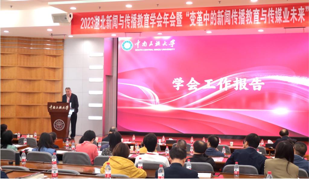 邊境致歡迎辭。他表示,近年來,我校文傳學院人才培養體制機制持續完善,新聞傳播學科建設持續走深走實,專業發展蒸蒸日上,取得了一系列教育教學成果。他感謝湖北新聞與傳播教育學會對學校的信任與支持,并期待大家共同努力,不斷推動湖北高校新聞傳播教育矩陣建設。