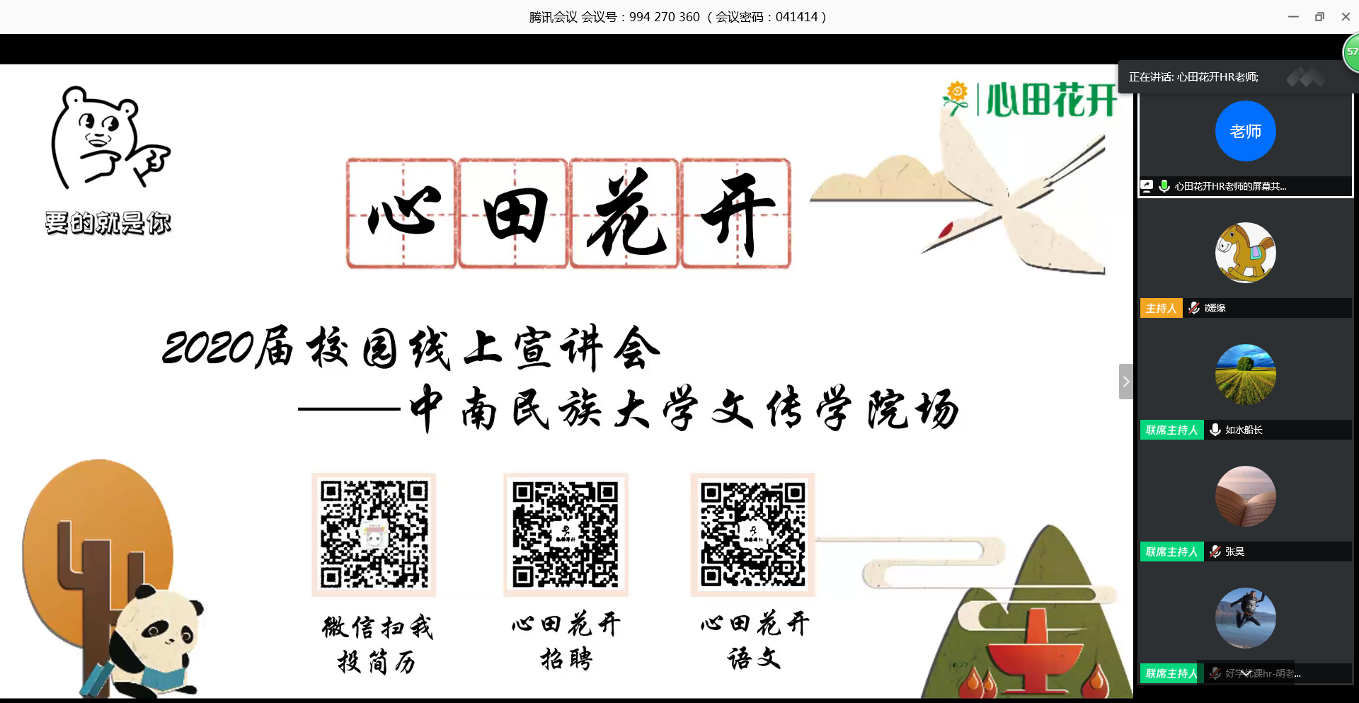 4月14日上午,文學(xué)與新聞傳播學(xué)院通過騰訊會(huì)議平臺(tái)組織了2020屆畢業(yè)生第三場(chǎng)線上專場(chǎng)招聘會(huì),邀請(qǐng)了武漢好學(xué)銘智教育科技有限公司、武漢市硚口區(qū)如水培訓(xùn)學(xué)校有限公司、成都心田花開科技有限公司等三家教培類知名企業(yè)進(jìn)行宣講;文傳學(xué)院黨委副書記張文軍、2016級(jí)輔導(dǎo)員郭旋、卡迪爾旦以及110余名畢業(yè)生參加此次宣講會(huì),本次宣講由郭旋主持。