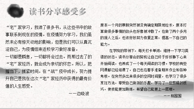 新傳1902班的邊曉波同學說:“‘宅’家學習,我讀了很多書,這段時間讓我可以認真沉淀自己,為疫情結束返校學習做好準備。把握當下,抓緊時間,在‘戰’疫中成長,努力提升自己是我在這次‘宅’家經歷中獲得的最有價值的人生感受。”