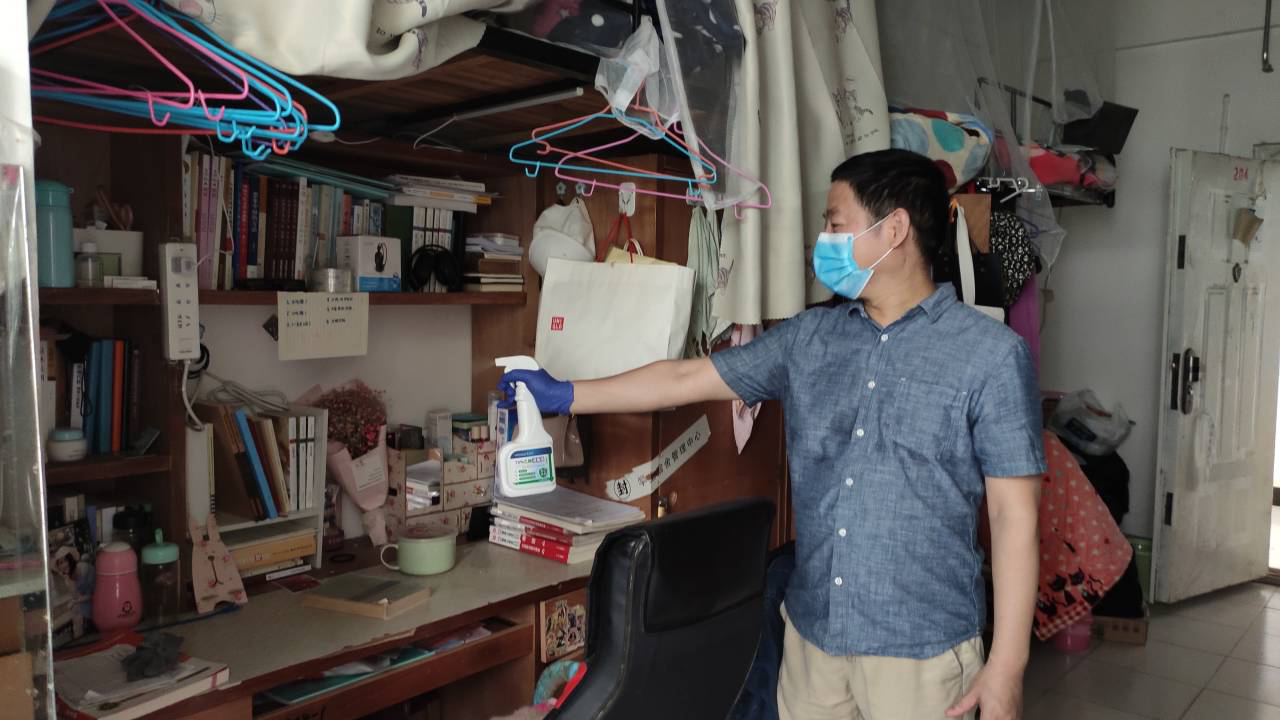學(xué)院領(lǐng)導(dǎo)班子成員悉數(shù)到場,部分教師遠(yuǎn)道而來,加入勞動(dòng)隊(duì)伍,分別到南區(qū)7、10棟,北區(qū)9A、3B的97間本科、研究生畢業(yè)生宿舍進(jìn)行消毒打掃。學(xué)院黨委書記韓昕在打掃前傳達(dá)了學(xué)校關(guān)于畢業(yè)生返校工作相關(guān)會(huì)議精神,強(qiáng)調(diào)要消除宿舍內(nèi)存在的安全隱患,用更充分的準(zhǔn)備和更嚴(yán)格的措施,保障學(xué)生安全返校。教職工們自覺形成各小組,并肩作戰(zhàn),帶著消毒打掃工具進(jìn)入每間畢業(yè)生宿舍,開窗通風(fēng),屋內(nèi)消毒,清潔地面,歸整桌椅等進(jìn)行了一場熱火朝天的“衛(wèi)生總動(dòng)員”。老師們來到學(xué)生宿舍,認(rèn)真地清掃垃圾、洗刷水池、擦拭桌面,不放過一些衛(wèi)生死角。清潔過后的宿舍,物品擺放整齊,室內(nèi)空氣清新,門把手和公共使用區(qū)消殺徹底,宿舍全面清潔灑掃。“宿舍已清掃,空調(diào)已清洗,歡迎回家”宿舍留言條的短短幾句話,字里行間流露出學(xué)院對學(xué)生們歸來的期待。