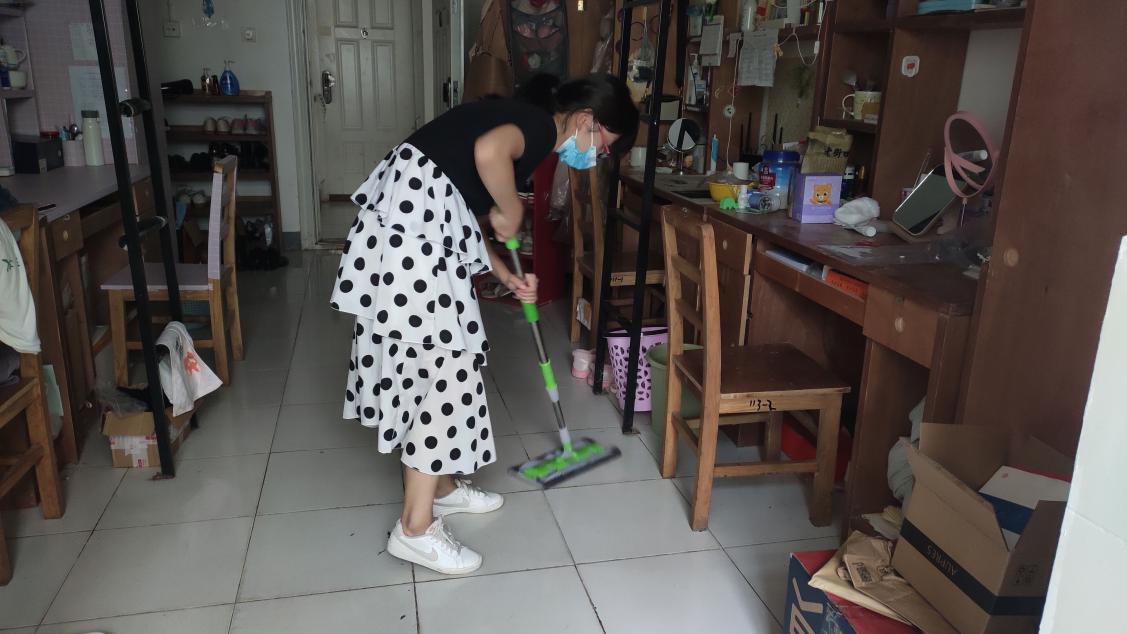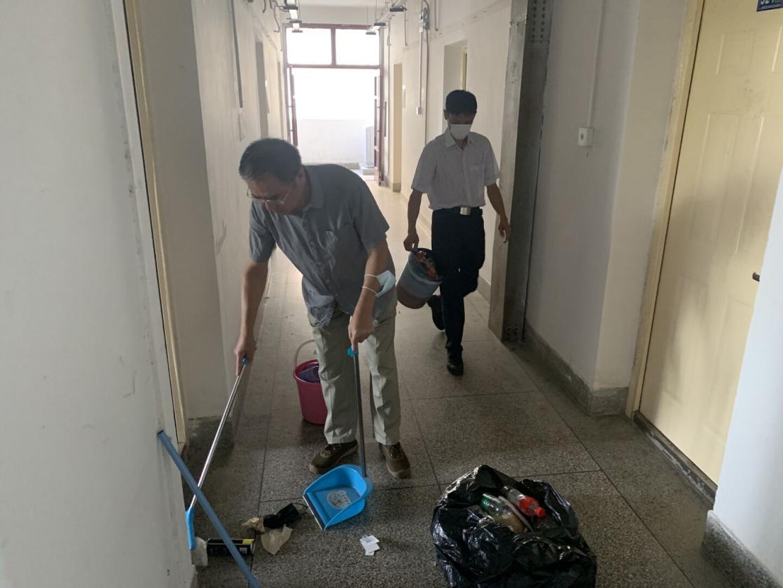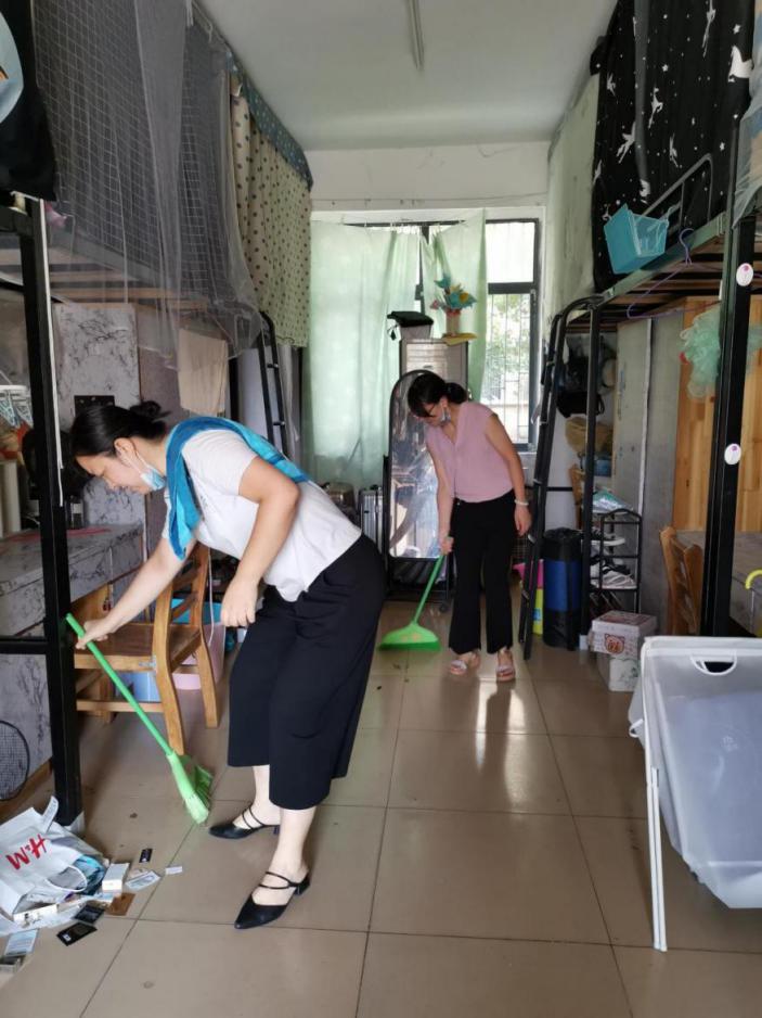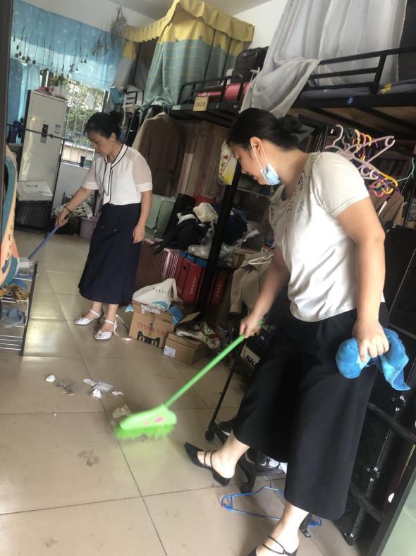 而韓昕書記等另一行人來到南區7棟、8棟、10棟等五棟宿舍樓,檢查并打掃了近200間宿舍。老師們走進沉寂大半年的學生宿舍,檢查寢室環境衛生、開窗通風透氣、細心整理歸置物品、掃地清理垃圾……已經到了夏季的尾巴,天氣卻依然炎熱,老師們握著掃把,低身彎腰,將地板上的垃圾掃進畚斗,清理過后的宿舍變得更加干凈整潔。