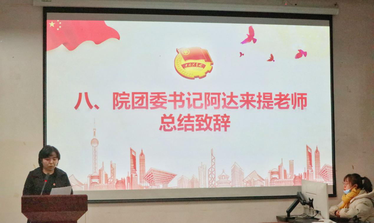 儀式結最后,我院團委書記阿達來提總結致辭。她希望全體團員可以牢記自己共青團員的身份,起帶頭模范作用,努力完成各項任務,并擁有陽光心態,尊敬老師,熱愛同學,強調共青團員需要有責任意識,應嚴格要求自己,積極努力追求真理,為實現中華民族偉大復興的中國夢而不懈奮斗。