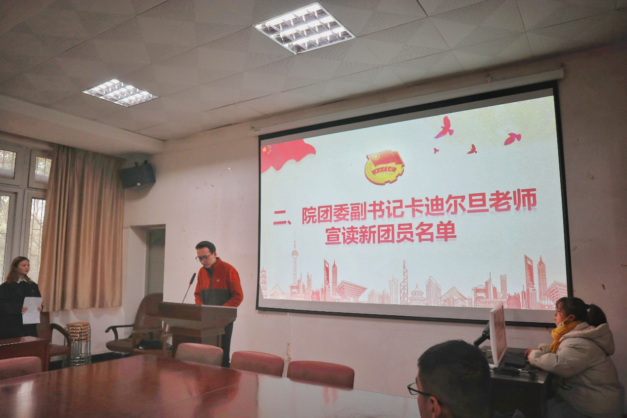 大會開始,全體人員起立奏唱國歌。阿達來提老師與卡迪爾旦老師宣讀2020年新團員名單并授予團徽。全體新團員隨后進行了莊重宣誓,認真觀看并學習“入團第一課”視頻。