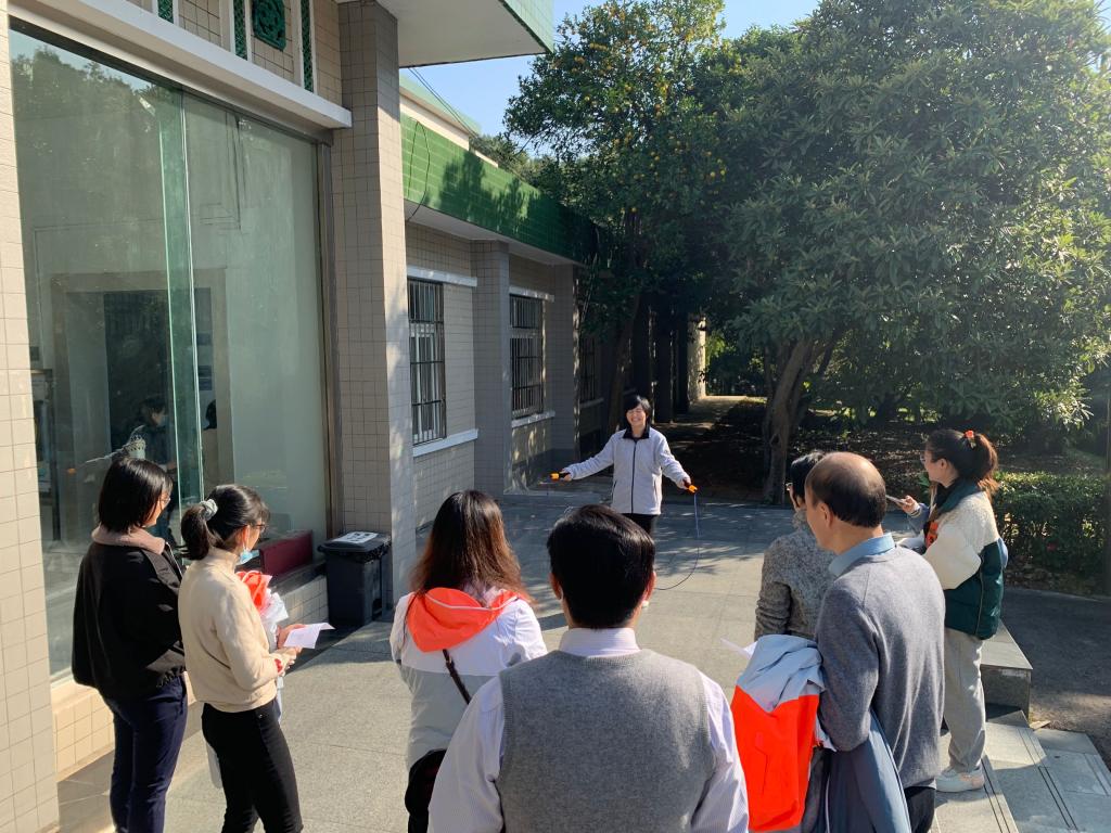 大廳外是跳繩項目,沐浴著陽光,教師們跳動起來。也有不少圍觀老師發出感嘆:“身體素質不如以前了,還是要多加強鍛煉才行。”