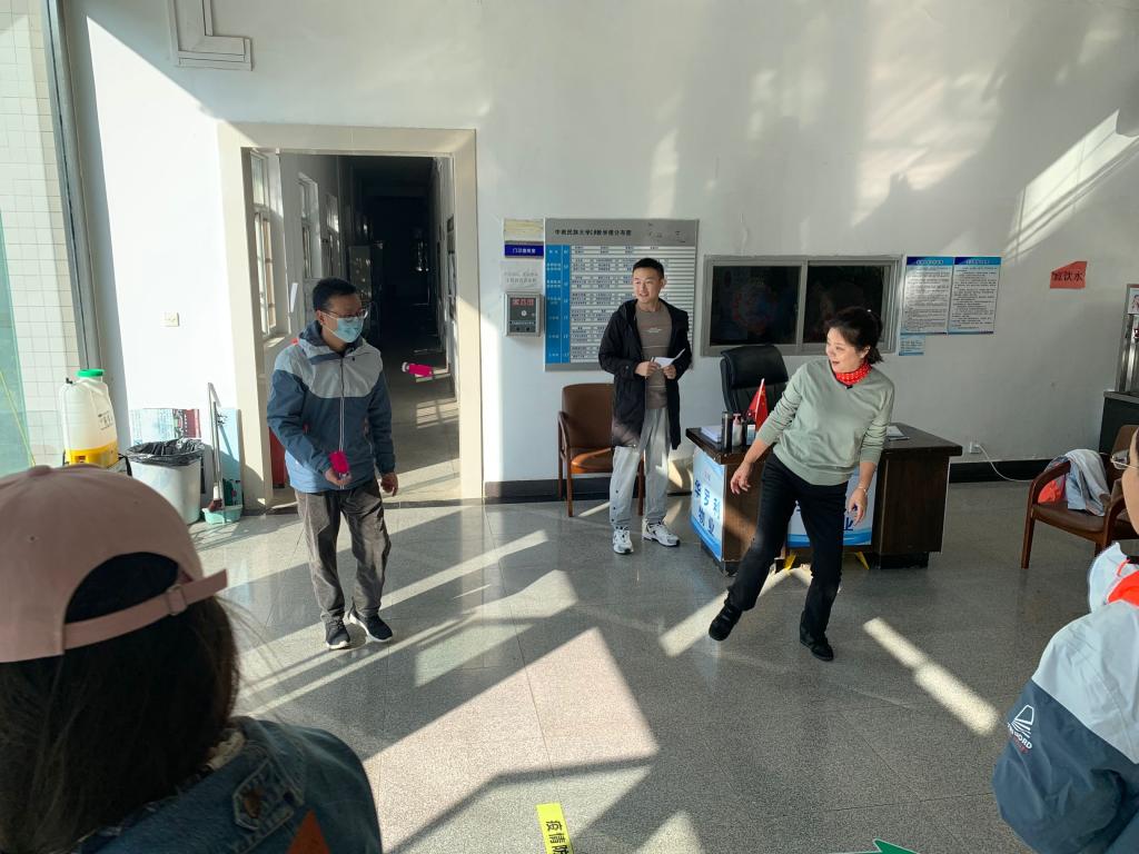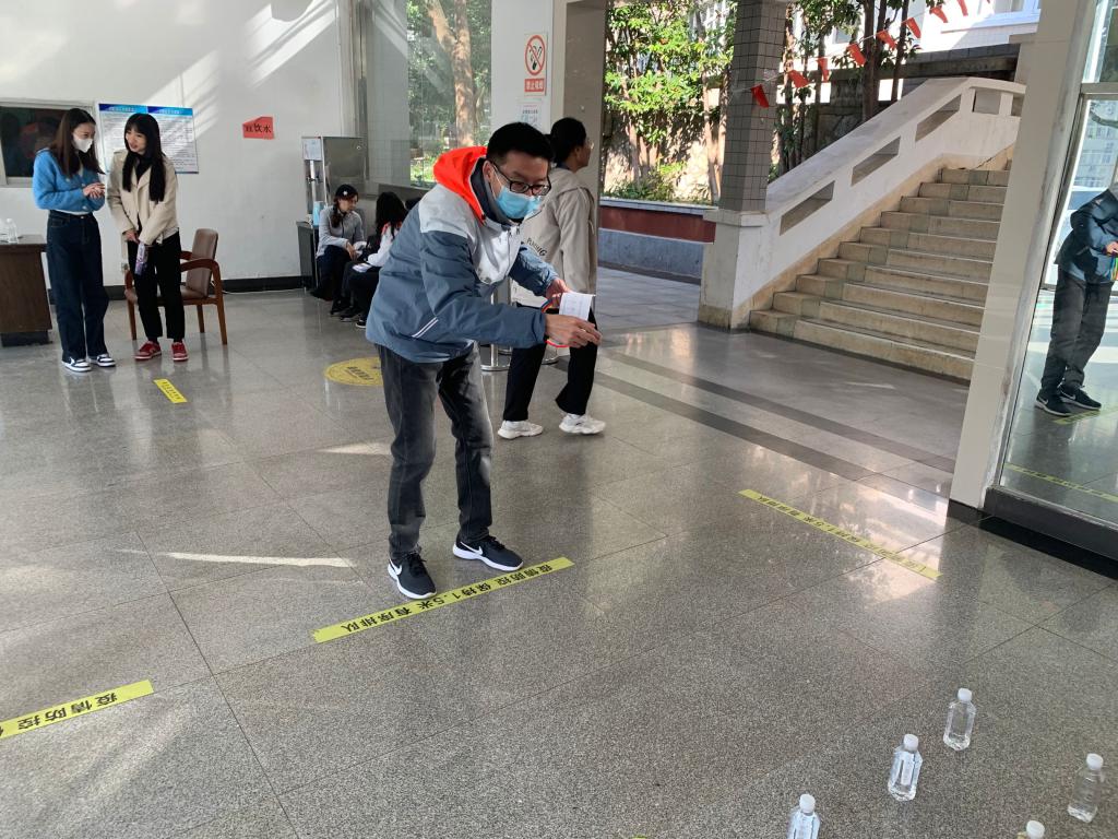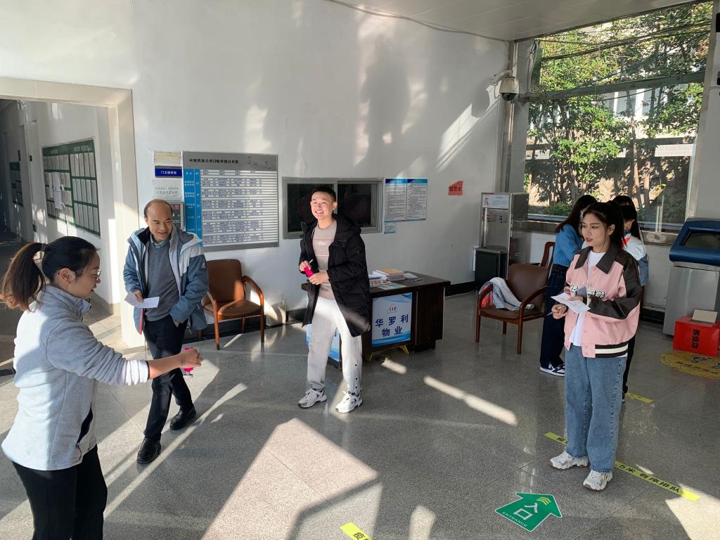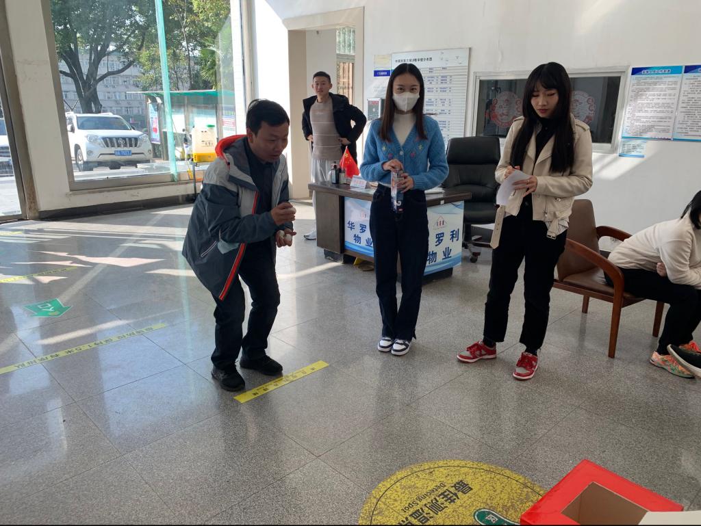 首先,朱晶晶老師為每位參賽教師發放參賽卡,教師們憑借參賽卡參與對應活動項目,每通過一個項目,記錄員便會在參賽卡上登記成績。活動大廳歡聲笑語,人來人往,只見教師們手拿飛鏢,眼睛瞄準,揮手一扔,動作一氣呵成。旁邊是踢毽球項目,教師們都脫掉外套,輕裝上陣,靈活的手腳讓教師們獲得了不錯的成績。