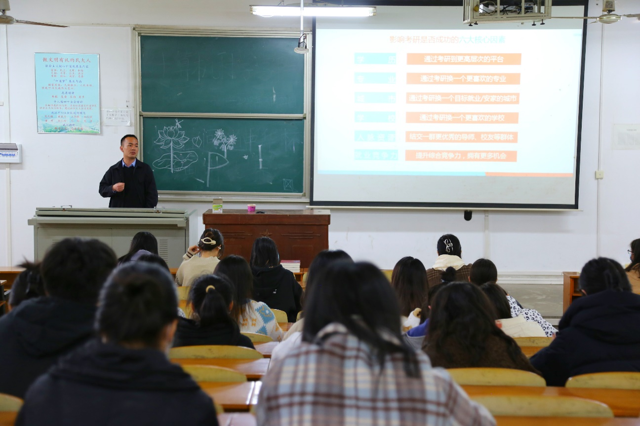 本站訊(通訊員馬曉怡 攝影梁悅娜)為進一步營造我院考研良好氛圍,幫助同學們打破信息壁壘,制定科學的復習策略和理性擇校擇專業(yè),3月24號下午,我院于文一樓201教室開展2024屆考研全程復習規(guī)劃及院校專業(yè)選擇指導講座,我校就業(yè)指導客座教授胡凱應邀為我院2020級學生進行指導。