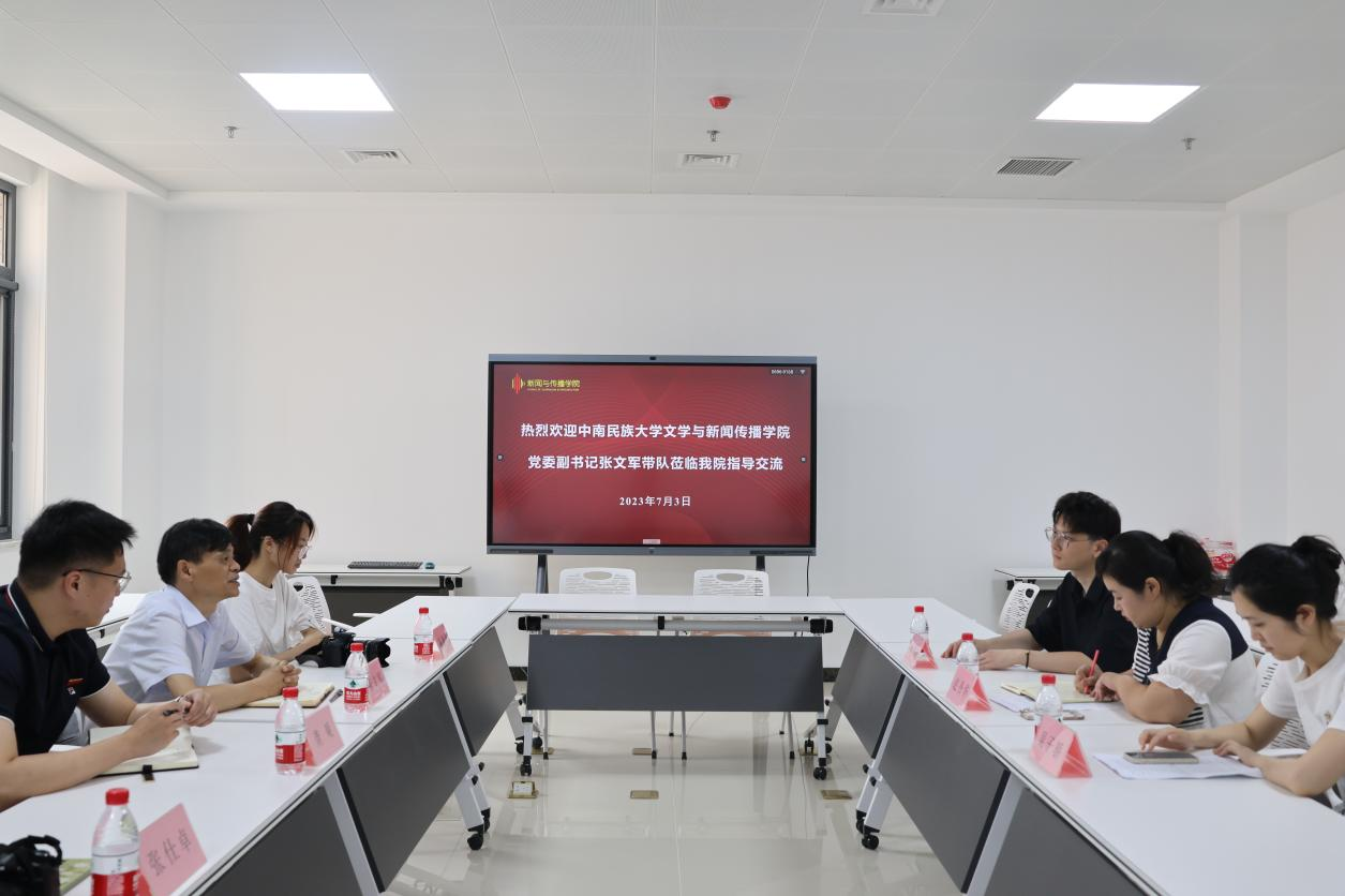 (通訊員張仕卓 攝影易靜琳)7月3日上午,我院黨委副書記張文軍、專職輔導(dǎo)員龔觀赴中央民族大學(xué)新聞與傳播學(xué)院開展大學(xué)生就業(yè)工作專題調(diào)研,針對(duì)學(xué)生就業(yè)和學(xué)生管理工作等問題進(jìn)行了深入交流。本次座談會(huì)由中央民族大學(xué)新聞與傳播學(xué)院黨委副書記趙丹華主持,學(xué)院團(tuán)委書記吳子驕、專職輔導(dǎo)員林煥祥陪同調(diào)研。