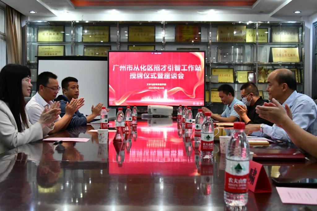 本站訊(通訊員浩嘉欣攝影鄒云強)為進一步加強校地合作,提高人才培養質量,促進畢業生高質量就業。9月22日下午,我院在文一樓203會議室召開廣州市從化區招才引智工作站授牌儀式暨座談會。校友廣州市從化區宣傳部副部長葉平、湖北長江教育傳媒集團全媒體數字運營中心主任張蕓等一行受邀參加會議,我院黨委書記謝嵐、院長陶喜紅、副院長陳嘯、黨委宣傳部副部長雷長生、招生就業處副處長朱軍出席會議。我院黨委副書記牛磊主持會議。
