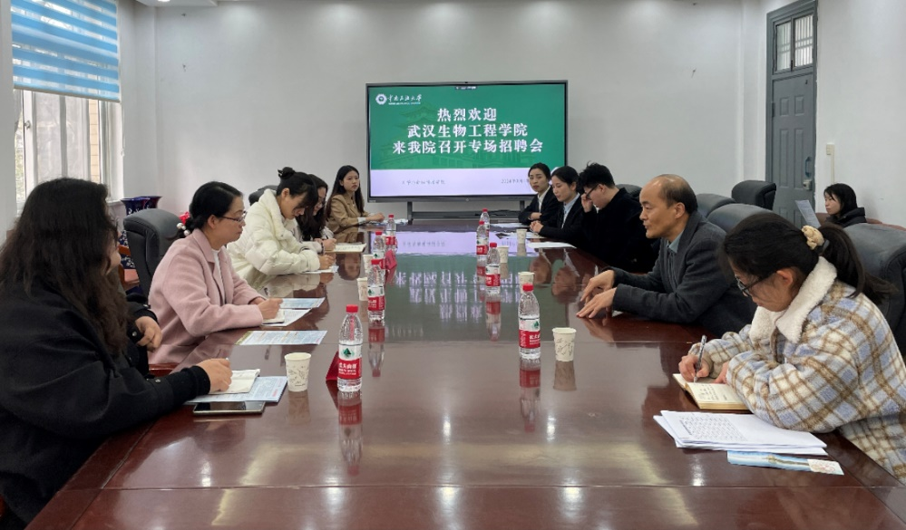 本站訊(通訊員:閆怡冰 攝影:陳麗麗)3月18日下午,武漢生物工程學院文學院黨總支書記、常務副院長黃亞蘭,校人事處副處長穆青,文學院黨總支副書記袁寧和文學院辦公室主任侯晶茹代表武漢生物工程學院來我院召開專場招聘會,陶喜紅院長、熊英副院長、王芳老師和部分碩士研究生參會。