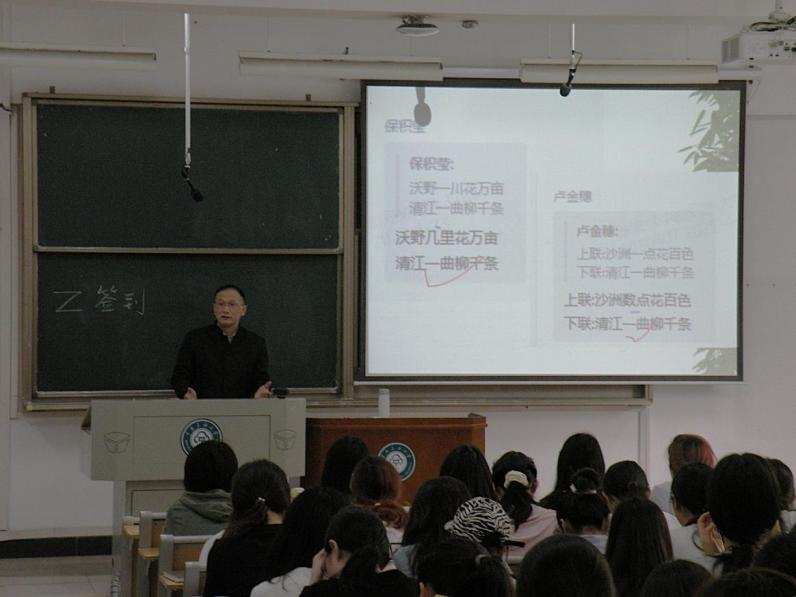 4月25日,涂波老師的“古典詩詞賦聯寫作”課堂以詩詞創作與評析為核心,通過提問互動、作品評析等方式強化學生正確運用詩詞格律的能力。課程伊始,涂波老師通過品鑒學生創作的對聯,復習了詩詞對仗的基本要求,包括字數相等、詞性相同、結構相似和平仄相對。針對沈暢同學的《江灘夜戀》,涂波老師建議將“晚浦”改為“淺浦”、“江風”調整為“輕風”,以柔化意境;對毛世暢同學的《自嘲為筆》,他巧妙修改尾句為“今日世人皆役我,百年之后我封神”,深化作品余韻。課程還結合龍榆生所著的《唐宋詞格律》深度解析《浣溪沙》《采桑子》等詞牌的押韻規律,強化“先葉韻,再調平仄”的創作原則。涂波老師以互動提問貫穿課堂,引導學生從朗讀中體悟古典詩詞的聲律之美。