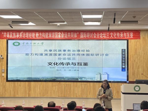 本站訊(通訊員:周依琳 攝影:周依琳)10月15日下午,“共享民族事務治理經驗 助力構建瀾湄國家命運共同體”國際研討會分論壇三“文化傳承與互鑒”在文一樓101會議室舉行,本次分論壇由文學與新聞傳播學語和外國語學院兩院聯合承辦。論壇上半場由文學與新聞傳播學院碩士生導師杜穎卉主持,文學與新聞傳播學院副院長、博士生導師陳峻俊教授擔任評議嘉賓。論壇下半場由外國語學院副院長、碩士生導師李明副教授主持,外國語學院副院長、碩士生導師李敏杰教授擔任點評嘉賓。