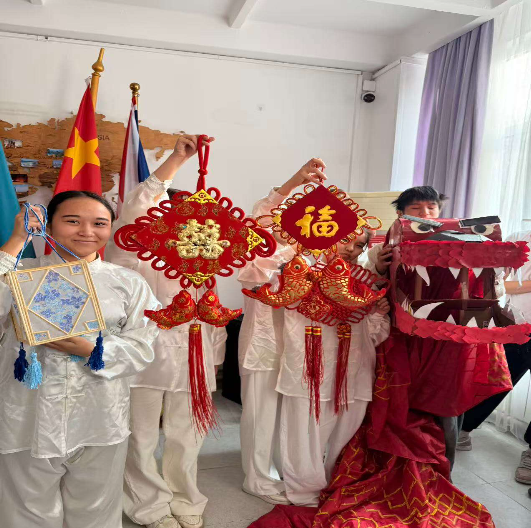 國(guó)際哈中語(yǔ)言學(xué)院學(xué)生們?cè)谏蠞h語(yǔ)HSK課程 漢語(yǔ)HSK課后與學(xué)生們的合照 在教學(xué)之余,實(shí)習(xí)團(tuán)隊(duì)積極融入當(dāng)?shù)匚幕群髤⑴c了國(guó)際哈中語(yǔ)言學(xué)院10月5日的教師節(jié)與10月30日的金秋節(jié)等校園活動(dòng)。在金秋節(jié)活動(dòng)中,四名同學(xué)一方面與當(dāng)?shù)貙W(xué)生共同慶祝豐收,感受他們對(duì)自然與傳統(tǒng)的熱愛;另一方面也積極宣傳中國(guó)文化的特色內(nèi)容。一名參與的學(xué)生表示:“這樣的沉浸式體驗(yàn),讓我們真正理解了文化不是停留在書本,而是活在節(jié)日、創(chuàng)作和日常交流中。” 金秋節(jié)活動(dòng)上學(xué)生創(chuàng)意作品展示 金秋節(jié)上中國(guó)文化作品的展示 通過幾個(gè)月的實(shí)地交流,實(shí)習(xí)團(tuán)隊(duì)在多方面獲得了顯著成長(zhǎng)。專業(yè)層面,他們將課堂所學(xué)應(yīng)用于真實(shí)場(chǎng)景,在解決實(shí)際問題的過程中深化了對(duì)本專業(yè)的認(rèn)知,增強(qiáng)了實(shí)踐運(yùn)用能力。在跨文化交際方面,他們對(duì)文化差異的理解從書本走向現(xiàn)實(shí),不僅學(xué)會(huì)了在多元背景下靈活應(yīng)對(duì)、換位思考,也更深刻體會(huì)到中華文化的包容力與適應(yīng)性。
