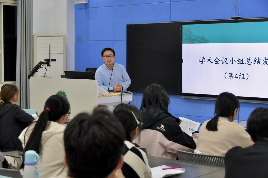 11月4日的活動以學術會議形式進行,分六個小班同步開展。各班教師發布經典文本題庫,引導學生圍繞論題展開小組討論。同學們在研讀經典后,進行激烈思辨。隨后,各小組代表登臺匯報成果,展現扎實的文本研讀能力與團隊協作水平。互動環節中,不同觀點碰撞交融,深化了對論題的多維認知。