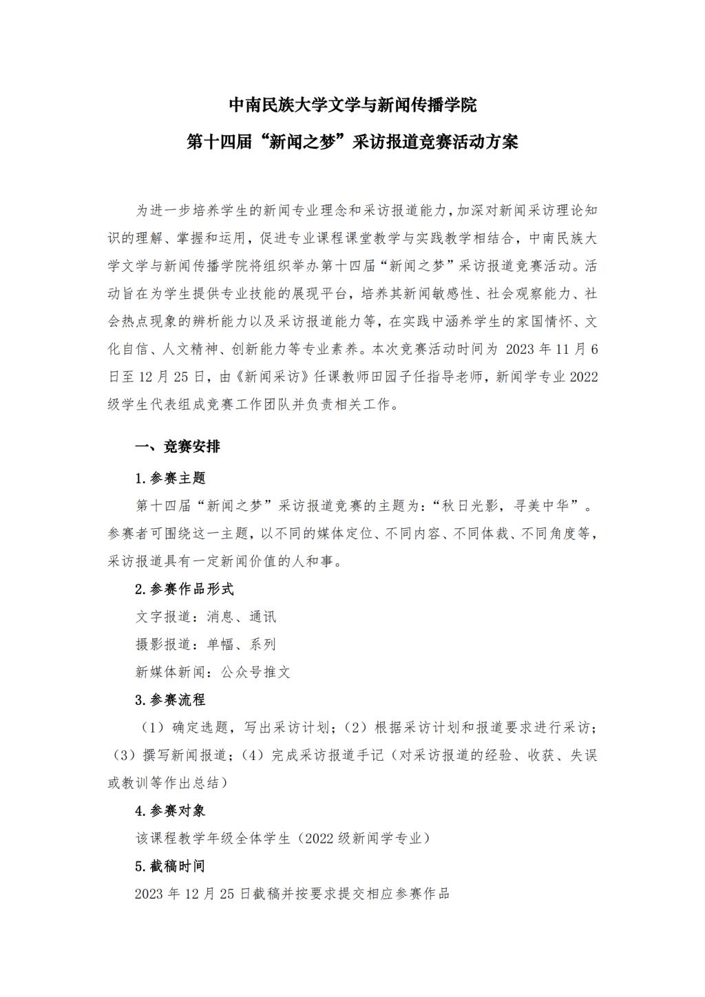 中南民族大學文學與新聞傳播學院第十四屆“新聞之夢”采訪報道競賽活動方案