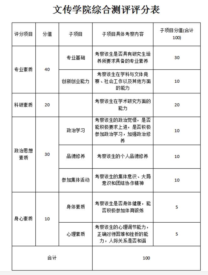 文學與新聞傳播學院關于做好推薦2022屆優秀本科畢業生 免試攻讀碩士學位研究生工作的通知 根據《關于做好推薦2022屆優秀本科畢業生免試攻讀碩士學位研究生工作的通知》的精神,我院今年推薦優秀應屆本科畢業生免試攻讀碩士學位研究生(以下簡稱推免)的工作已經開始。為了保證今年推免工作的順利開展,現將有關事項通知如下: 一、為了加強對推免工作的領導和管理,學院成立推免工作領導小組。領導小組組成人員如下: 組 長:雷灼霖 陶喜紅 副組長:陳嘯 謝榮娥 張文軍 陳峻俊 伍嵐 成 員:徐紅 郝永華 楊秀芝 陳明 夏耕 阿達來提 焦宜琳 劉中慶 二、推免生的條件按【民大教學(2016)12號】文件《中南民族大學推薦優秀應屆本科畢業生免試攻讀碩士學位研究生遴選辦法(修訂)》(http://webplus.scuec.edu.cn/s/27/t/1536/a/100720/info.jspy)的有關規定執行。 三、根據學校分配至學院的名額,我院今年推免生名額共計16名,另有替補推免生4名。具體名額分配如下:漢語言文學專業7名;漢語國際教育專業1名;新聞學專業4名;廣告學專業2名;廣播電視學專業2名。候補推免生按照中國語言文學2名和新聞傳播學學科2名分配。候補名額按專業和成績順序進行排序。 四、學院推免生工作基本辦法 1、堅持公開、公平、公正的原則。 2、推免生資源珍貴,申請推免的學生需要慎重選擇申請的學校,盡可能確保推免成功,避免推免生資源浪費。 3、工作程序 (1)初次資格審定:學院對申請推免生的學業成績、獎勵分成績進行審核。學業成績由焦宜琳老師和劉中慶老師負責,學生各類獎勵分由阿達來提老師負責。 (2)獎勵分答辯:學院推免工作領導小組即為獎勵分專家審核小組,對學生獎勵加分涉及的科研創新成果、論文、專利、競賽獲獎獎項及內容等進行審核鑒定。凡學生提供材料有弄虛作假、學術不端者,獎勵分判定為0,并取消推免資格。 (3)綜合測評:根據各專業推免生名額的1.5倍確定進入綜合測評環節學生名單。具體名單另行通知。綜合測評采用面試形式,由專家小組給定成績。具體評分標準見附件。 (3)成績計算方法 公式:綜合成績=學業成績×85%+綜合測評成績×7%+獎勵分成績×8%。