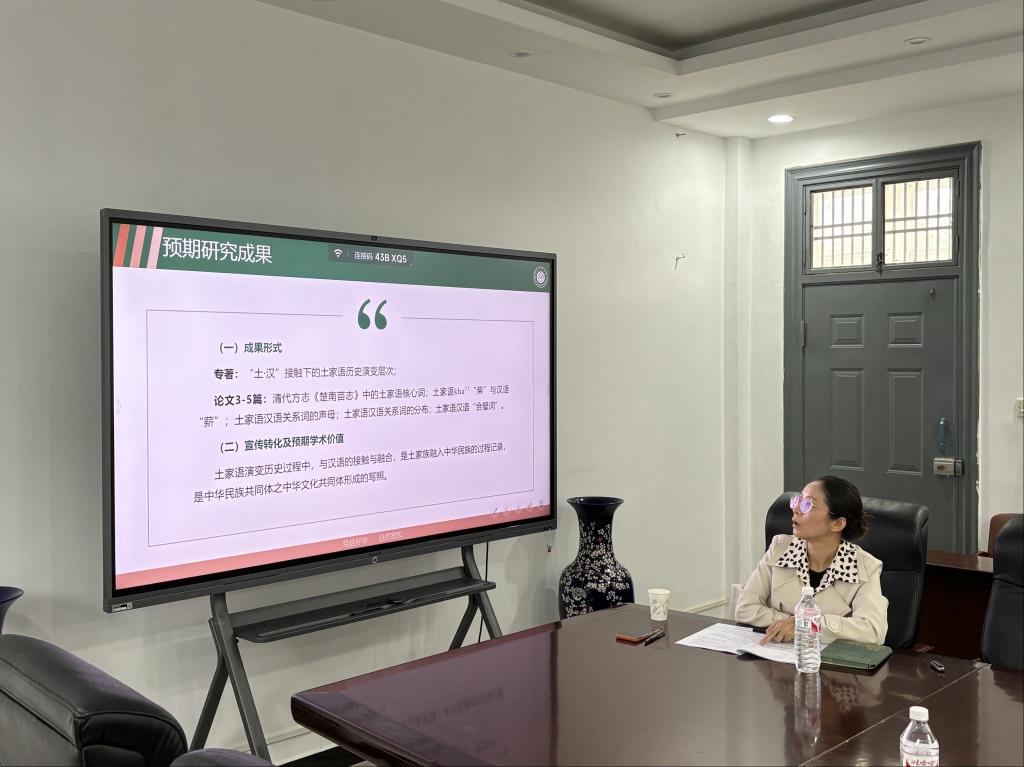 本站訊(通訊員:李妍 攝影:李妍)11月12日下午,2024年語言學國社科基金項目開題報告會暨2025年國社科基金項目申報第一輪論證會在文一樓203會議室順利舉行。項目負責人熊英副教授就《‘土·漢’接觸下的土家語歷史演變層次研究》進行開題匯報,華中師范大學汪國勝教授、華中科技大學程邦雄教授、學院邵則遂教授、謝榮娥教授、李素秋教授作為專家組成員參與本次會議。學院院長陶喜紅教授主持本次會議。