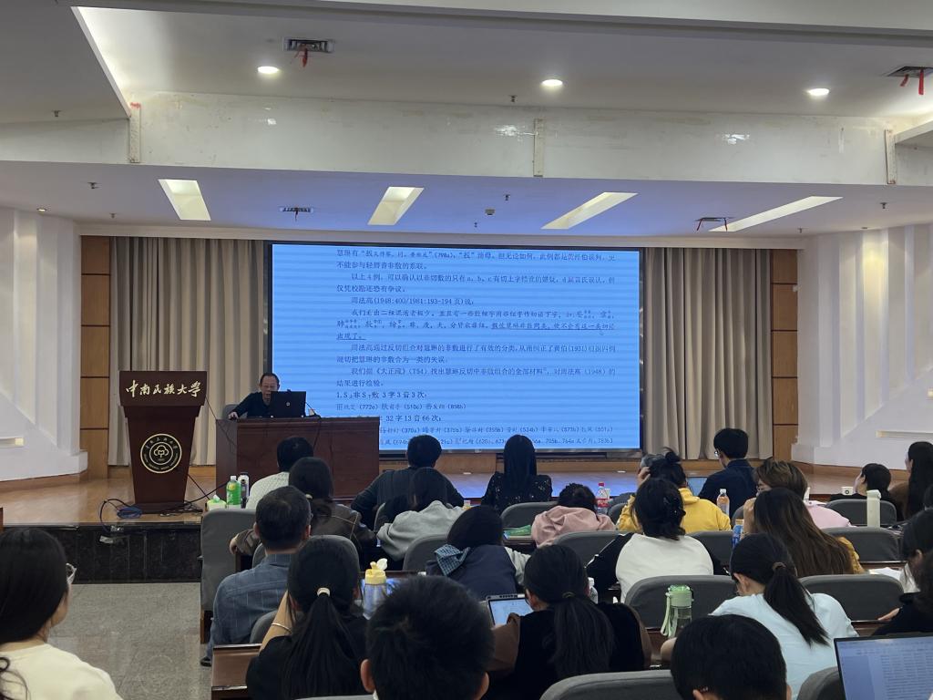 本站訊(通訊員:李長威 攝影:李長威)11月11日下午,學院邀請原貴州大學、安徽大學教授、博士生導師,現蘇州大學駐校學者特聘教授、安徽省語言學會會長楊軍在學術交流中心潤良學術報告廳做《反切析類法的依據與分析音類的功能》講座。講座由謝榮娥教授主持,學院博士生、碩士生及部分本科生參加。
