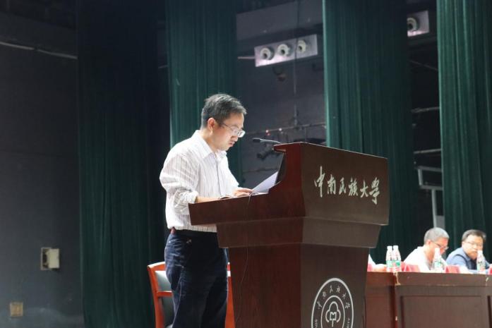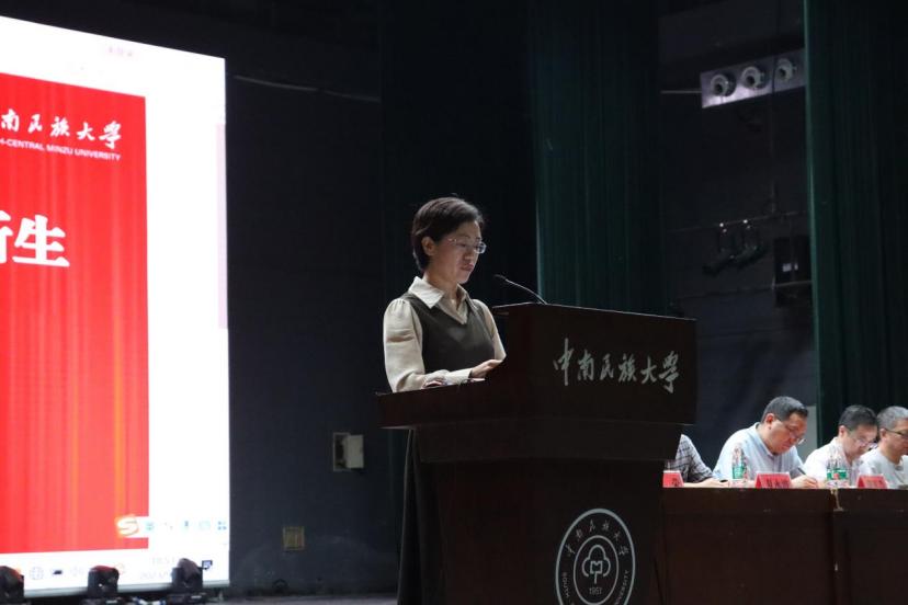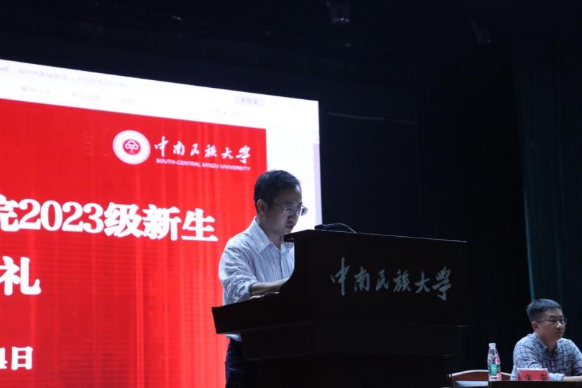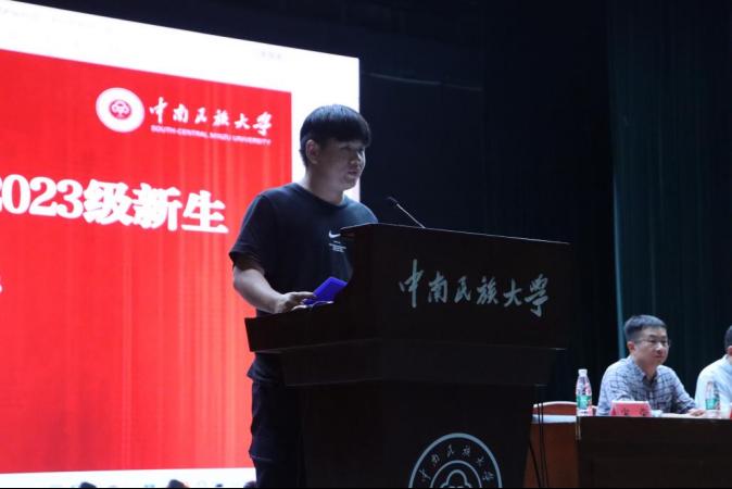 2023級本科生余瀟作為新生代表發言。余瀟分享了軍訓感悟,表達了對大學生活的憧憬與向往。他認為,大學是新的起點,要以一往無前的勇氣面對前路,以堅韌不拔的毅力步步前行,為自己在民大拼搏出一個無悔的青春。