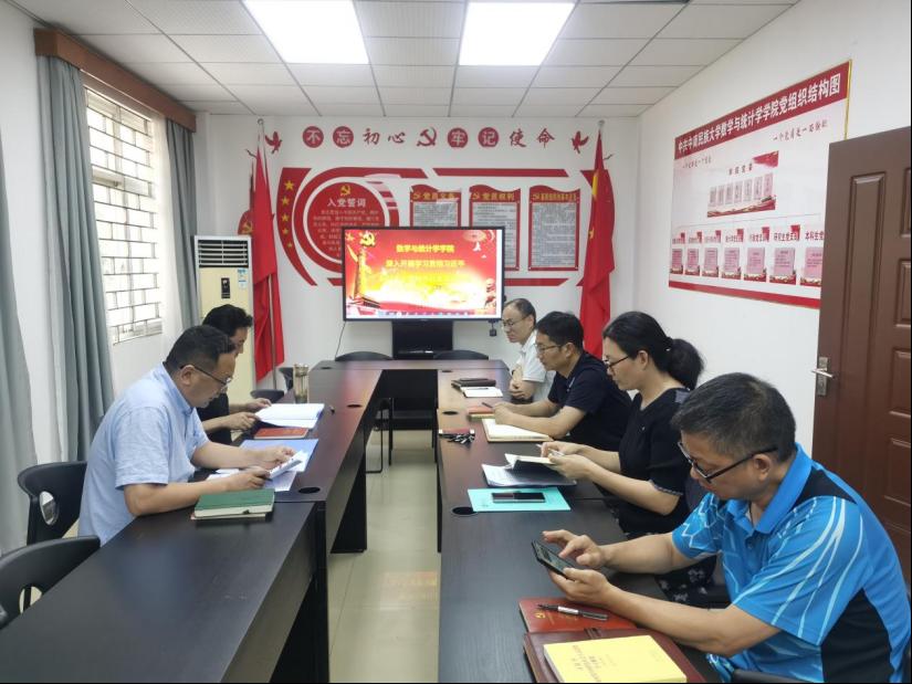 6月27日下午,數學與統計學學院全體黨委委員在9號樓129會議室深入開展學習習近平新時代中國特色社會主義思想讀書班第十四次學習會。此次學習會主要內容是開展主題教育研討會,并由學院黨委副書記、院長胡軍浩,黨委副書記郭琳2位同志分享學習心得體會。學院全體黨委委員參與學習。