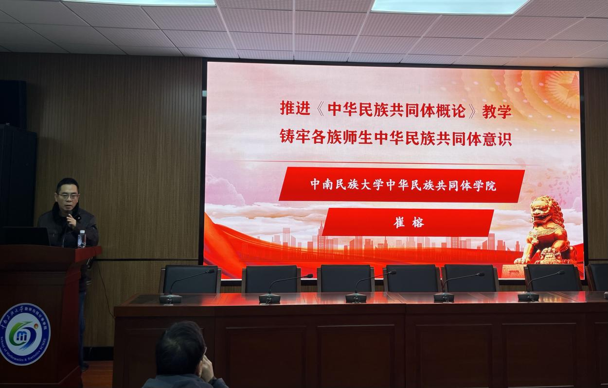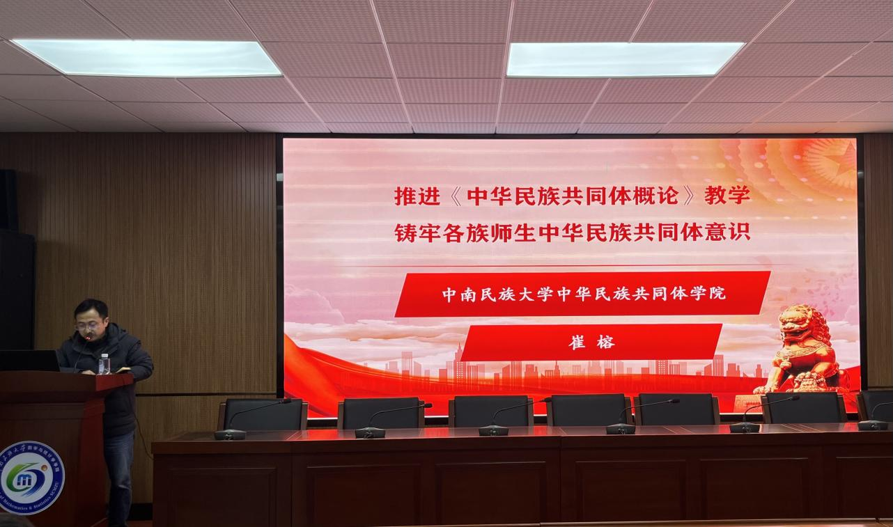 為貫徹中共中央政治局第九次集體學習會議精神,落實國家民委、學校有關(guān)工作部署。11月30日下午,學院特邀中南民族大學中華民族共同體學院崔榕教授在學院309會議室為我院全體教師作題為《推進〈中華民族共同體概論〉教學 鑄牢中華民族共同體意識》主題宣講,學院領導班子成員、全體教工參加了此次宣講會,會議由學院黨委書記郭暉主持。