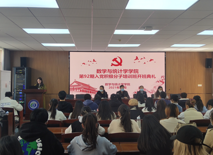 11月12日中午,數學與統計學學院第92期入黨積極分子黨校培訓班開班典禮在9號樓309會議室順利舉行。學院黨委書記李海濤、組織員周彩云、黨委副書記郭琳、分團委書記兼2021級輔導員阿依達娜出席開班典禮。此次開班典禮由學院2018級、2019級輔導員張箐沁老師主持。