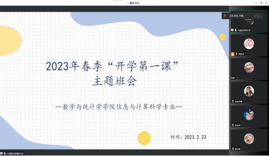 春風(fēng)浩蕩滿目新,揚帆奮進(jìn)正當(dāng)時。為落實教育部和湖北省教育廳關(guān)于春季學(xué)期安全開學(xué)的工作要求,引導(dǎo)學(xué)生踔厲奮發(fā)迎接新學(xué)期。近日,我院各班級相繼召開《開學(xué)第一課》教育主題班會,學(xué)院各班級班導(dǎo)師擔(dān)任《開學(xué)第一課》主講人,因仍有部分學(xué)生未返校,此次班會采取線上線下相結(jié)合的方式進(jìn)行。
