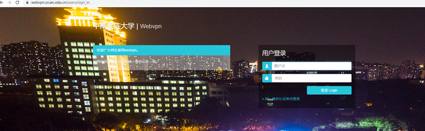 在瀏覽器輸入https://webvpn.scuec.edu.cn用戶名、密碼與統(tǒng)一身份認(rèn)證一致。