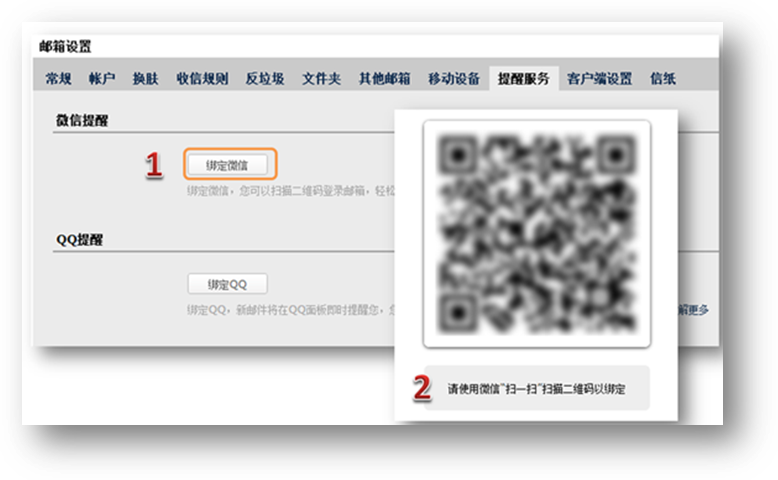登錄郵箱后,選擇“設(shè)置”-“提醒服務(wù)”-“微信提醒”,點(diǎn)擊“綁定微信”,頁(yè)面會(huì)顯示一個(gè)二維碼,此時(shí)打開(kāi)微信,使用“掃一掃”功能掃描此二維碼。綁定成功后,可以用微信查閱、回復(fù)新郵件,查詢同事的聯(lián)系方式,還可掃描登錄郵箱。