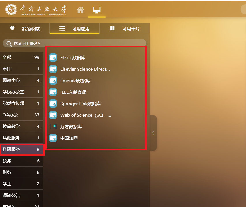 2、認證成功后,在左側“可用應用”選項卡中查找“科研服務”,點擊相關電子數據庫資源即可直接進入 查詢 或 下載 電子資源(無需使用VPN認證),如下圖所示: