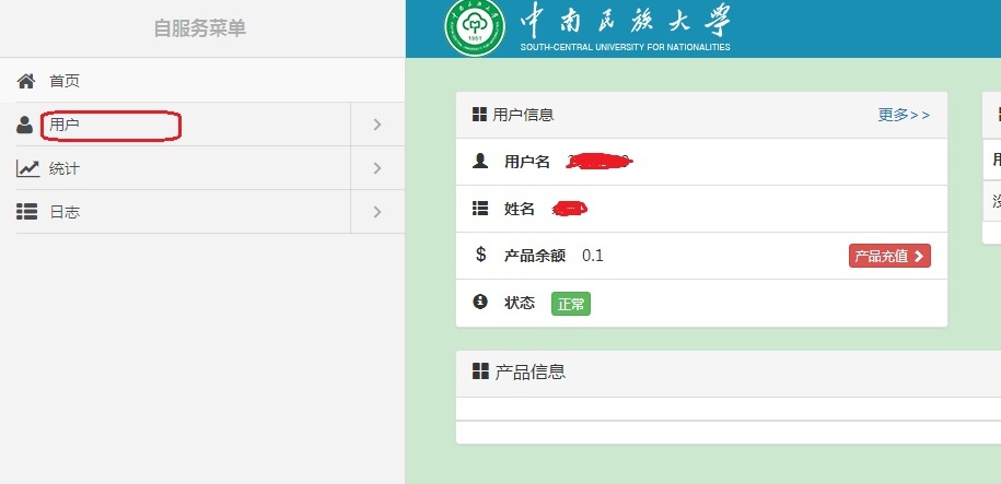 步驟2:進入到“校園網認證自服務”首頁,點擊左側菜單欄“用戶”選項卡,如下圖所示。